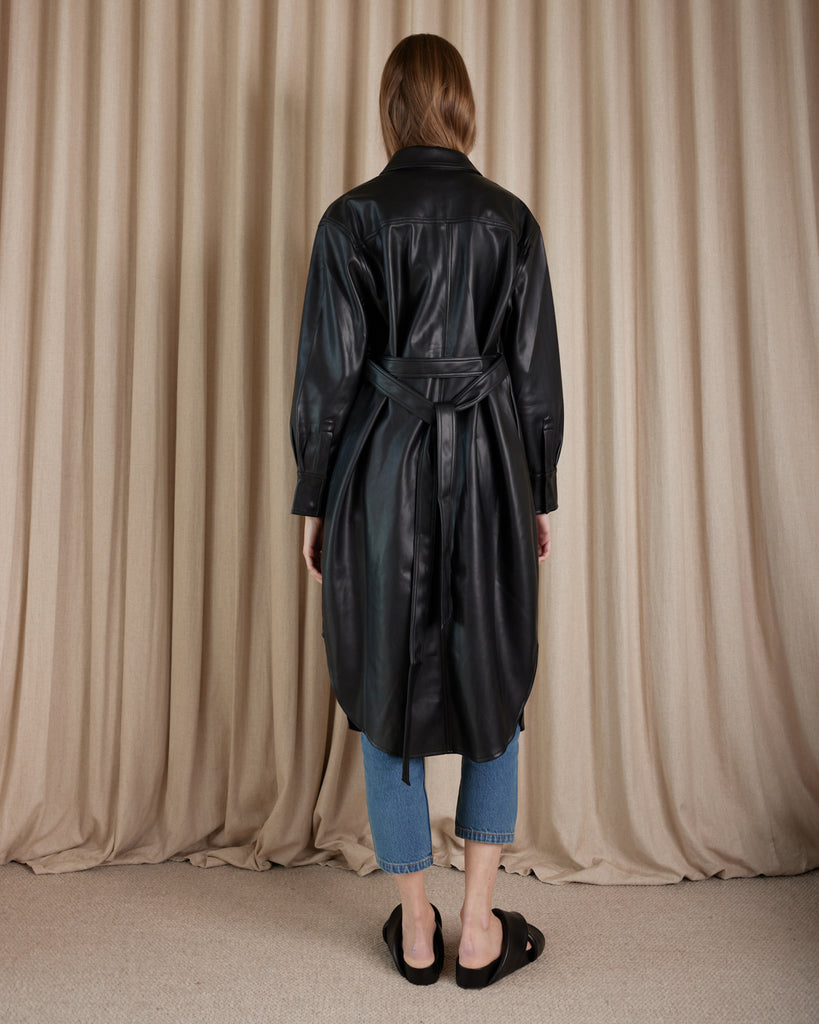 Cut in a supple vegan nappa, the Bolt Vegan Leather Shirt Dress is a versatile piece to be worn on its own or as a layering piece. Featuring a self-covered snap button closure, self-tie waist belt and a curved hem, it’s a classic transeasonal piece intended to stand the tests of time. A soft, sueded lining provides extra warmth, and hidden side slit pockets are perfect for cold hands or storing your phone. Pair with the mock neck Everleigh Top, Saddler Leggings, and your preferred boots.