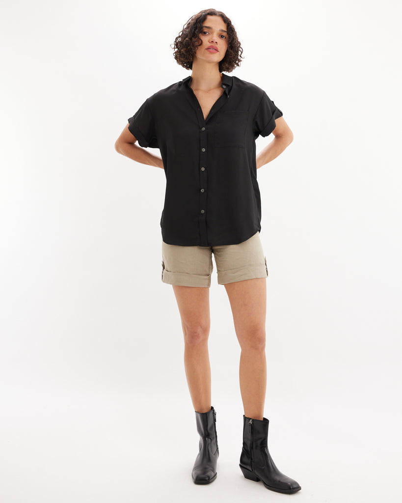 The Muriel Buttoned Short Sleeve Shirt is an effortless everyday staple with a clean, relaxed silhouette. It features a classic button-down front, soft drape, a chest pocket, and rolled short sleeves with button tabs. Designed for easy styling, this piece transitions seamlessly from weekday to weekend.