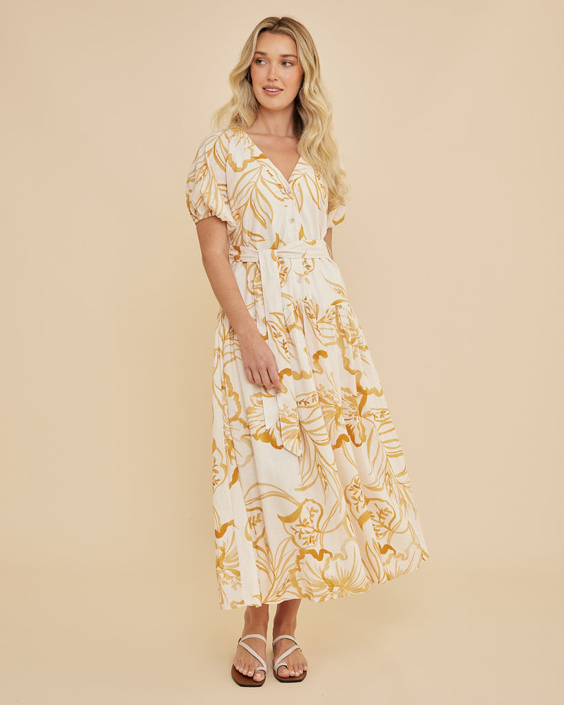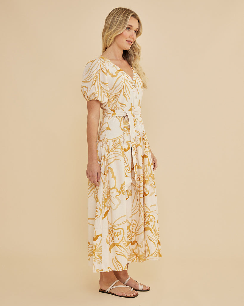 Our Rosemallow Puff Sleeve Midi Dress brings romantic charm to everyday moments - a flowing piece adorned with delicate watercolor hibiscus blooms, inspiring a resort mood wherever you go. This feminine design features graceful puff sleeves in a flattering raglan cut, and a buttoned v-neckline. The relaxed drop waist skirt and self-tie belt create effortless movement with adjustable shaping.