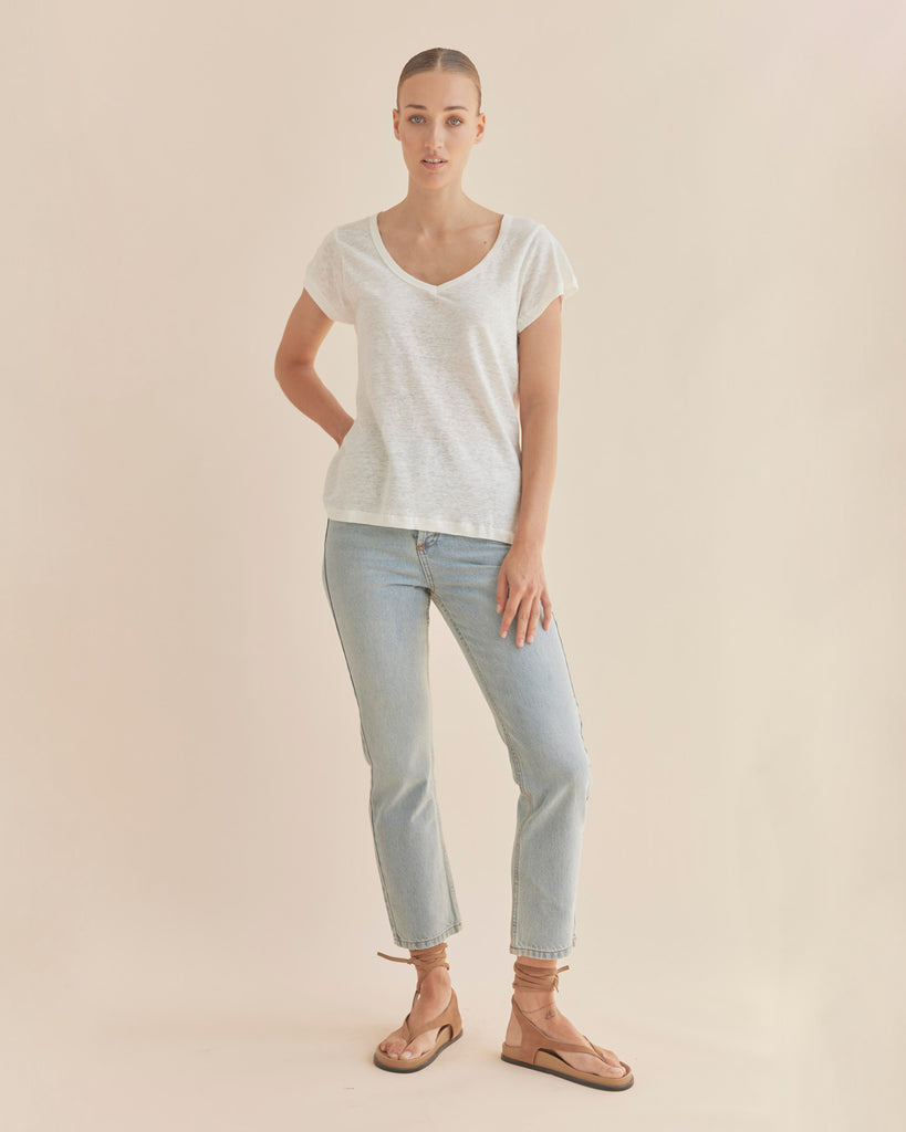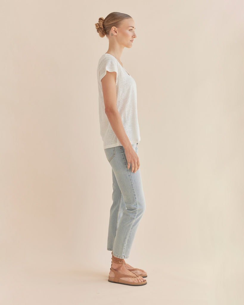 The Newport Linen T-Shirt is the ultimate wardrobe staple for all of your basic needs. Made with 100% linen jersey fabrication, a low scoop V-neck and relaxed fit, it’s breezy and lightweight for easy wear.