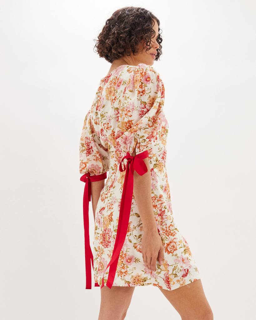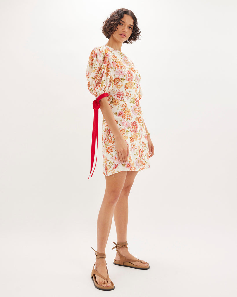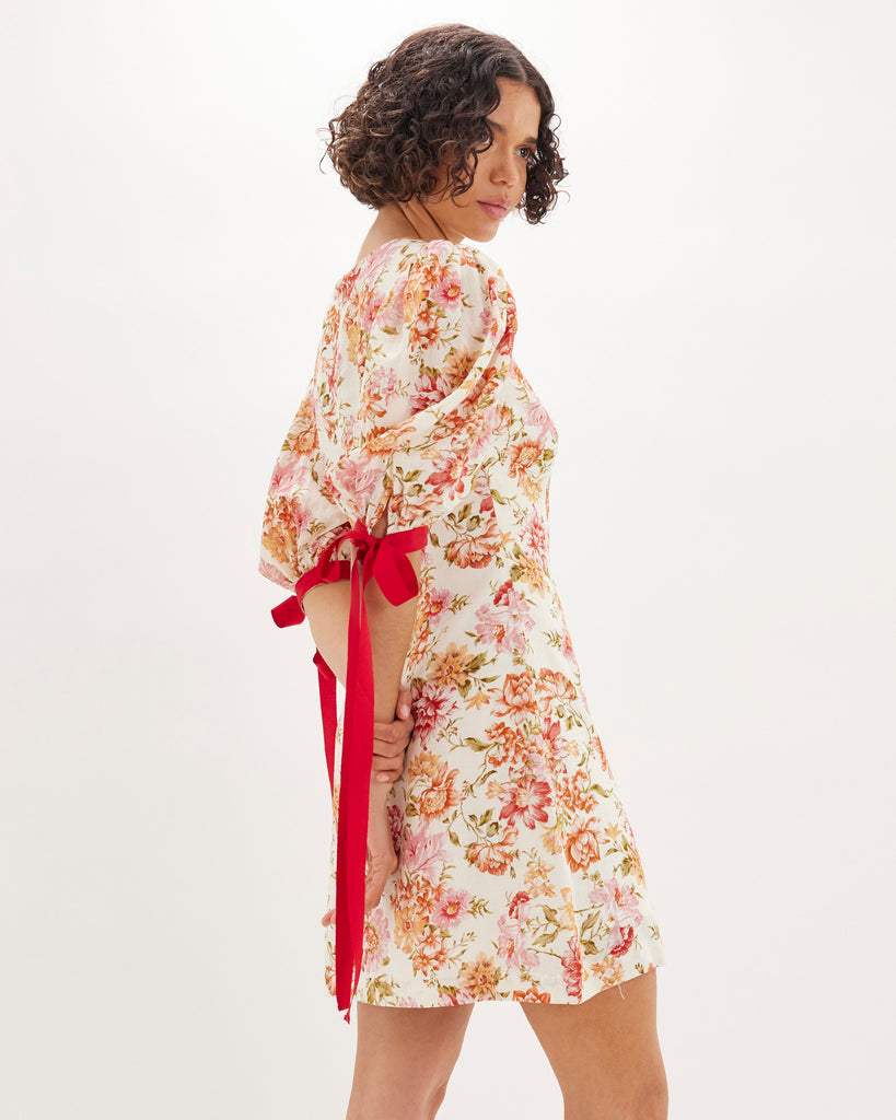 The Florine Mini Dress is crafted from a lightweight tencel-linen blend, showcasing a soft floral print. It features a classic round neckline, voluminous puff sleeves with contrast ribbon ties, and an A-line silhouette. Functional side pockets add a practical touch to this statement piece.