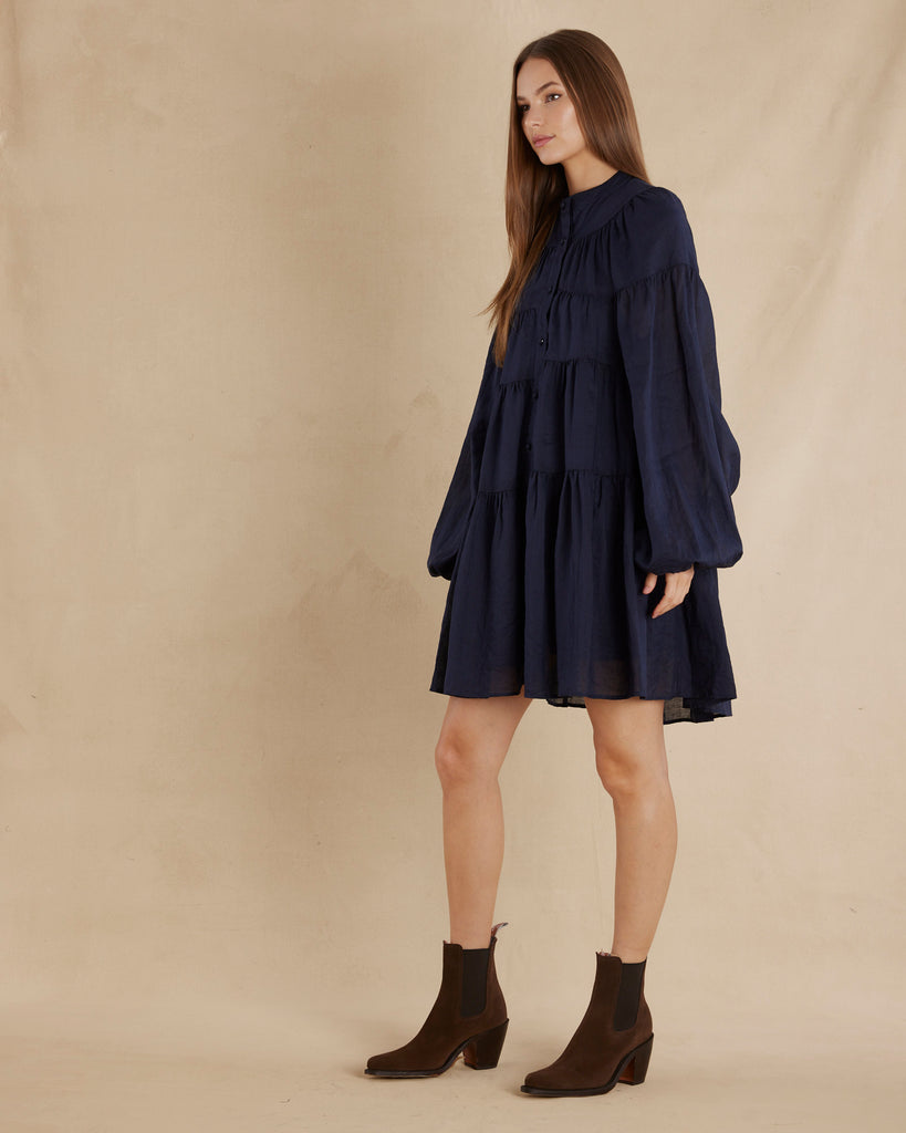 Isabelle Ramie Tiered Mini Dress - Navy