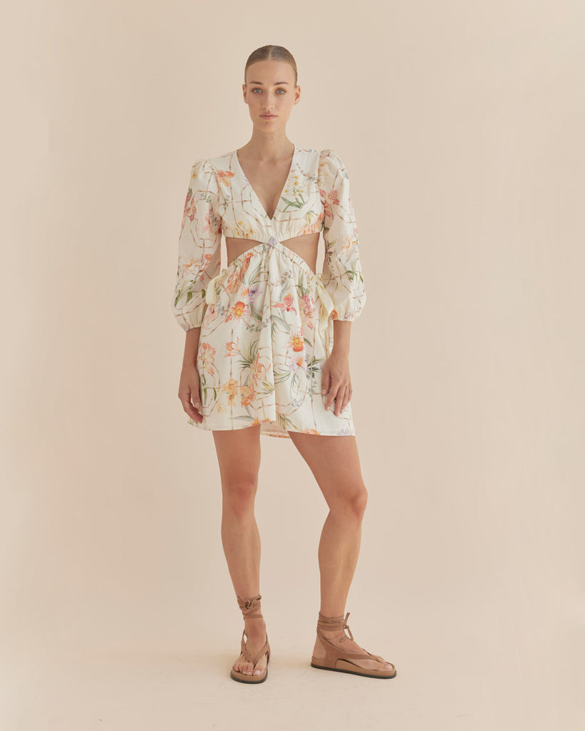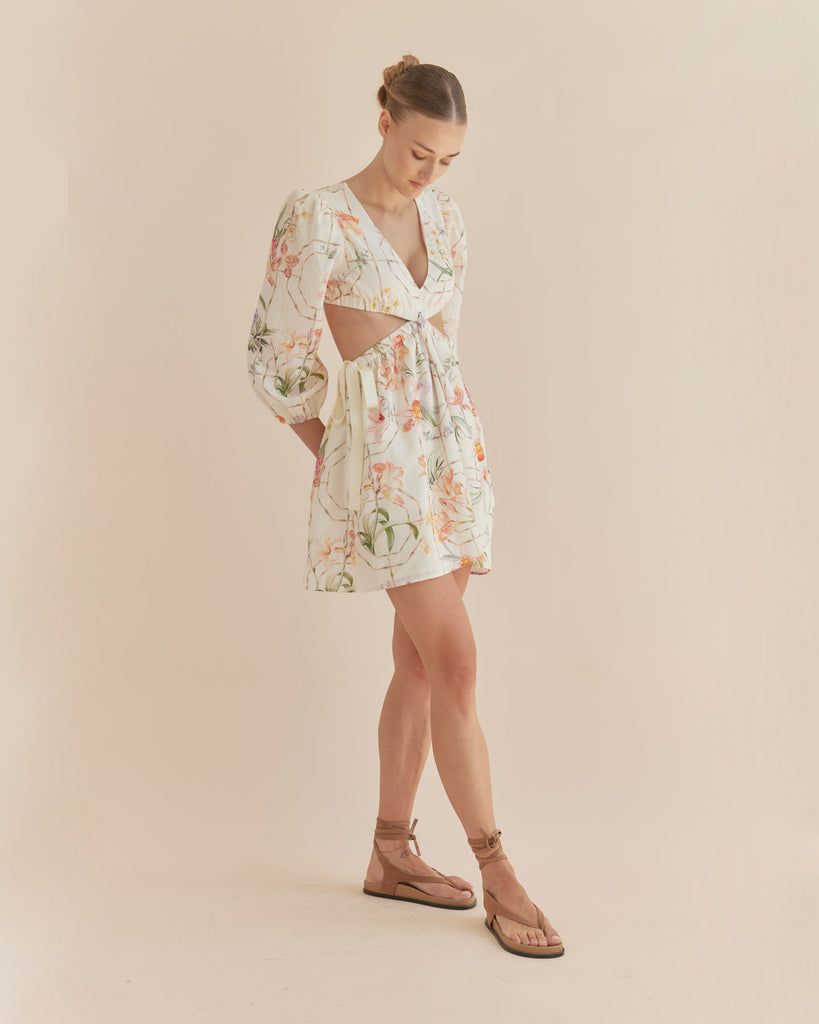 The Orangerie Long Sleeve Mini Dress combines romantic charm with modern flair. This dress features an exclusive print on a luxurious linen-viscose blend, with elegant cut-out details and voluminous sleeves that make it a standout piece for any occasion.
