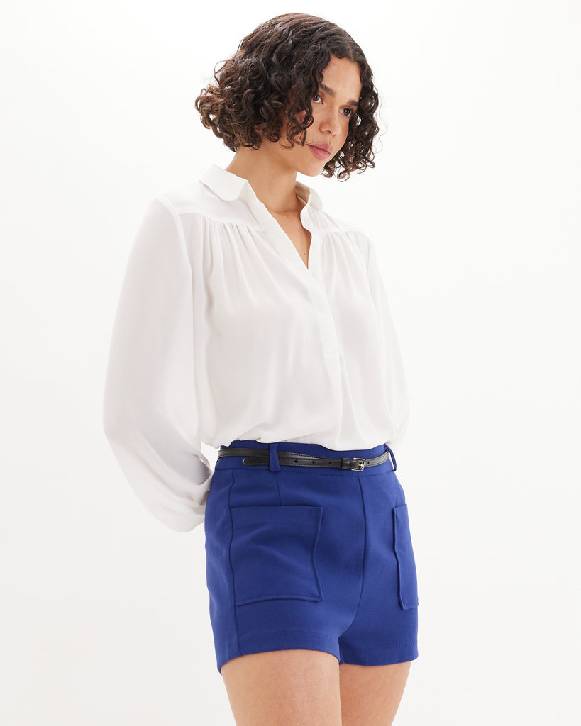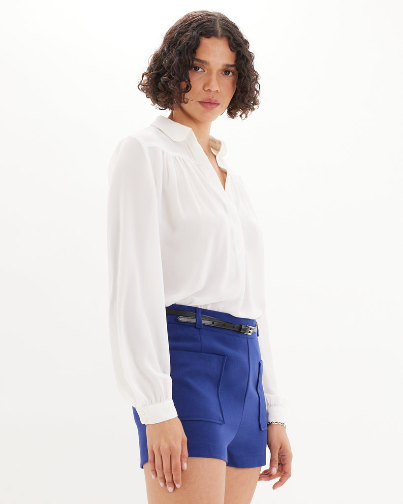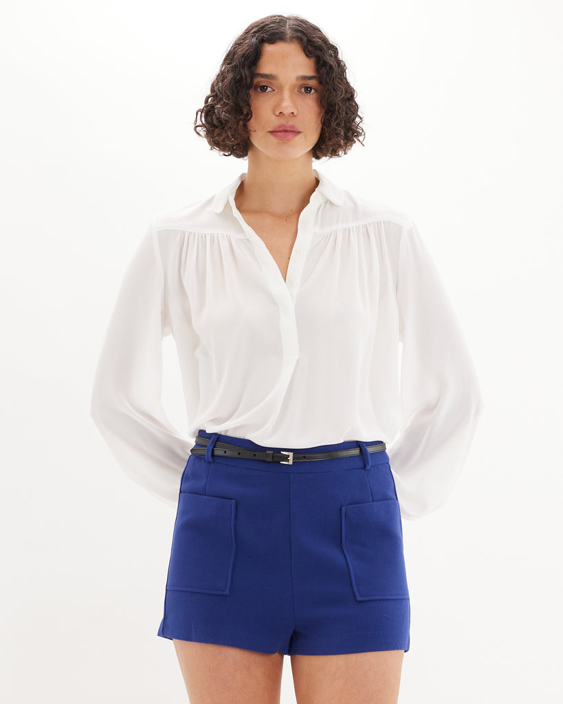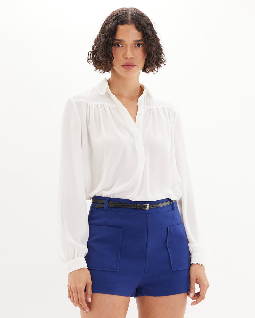 The Deborah Long Sleeve Shirt is a refined staple designed with effortless sophistication. It features a relaxed silhouette with a soft drape, gathered detailing, and a partial button placket. Finished with long sleeves and button cuffs, this timeless style transitions seamlessly from day to evening wear.