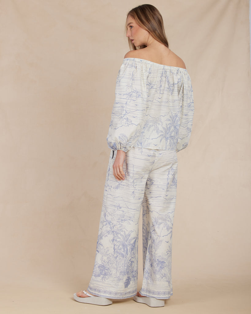 The Fresco Linen Billow Blouse features an elasticated bateau neckline, relaxed hem and ballooned sleeves, pair back with the Fresco Linen Pants for a vacation-ready ensemble.