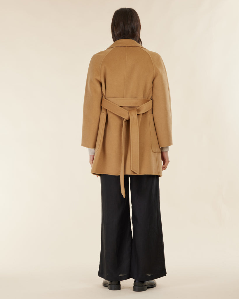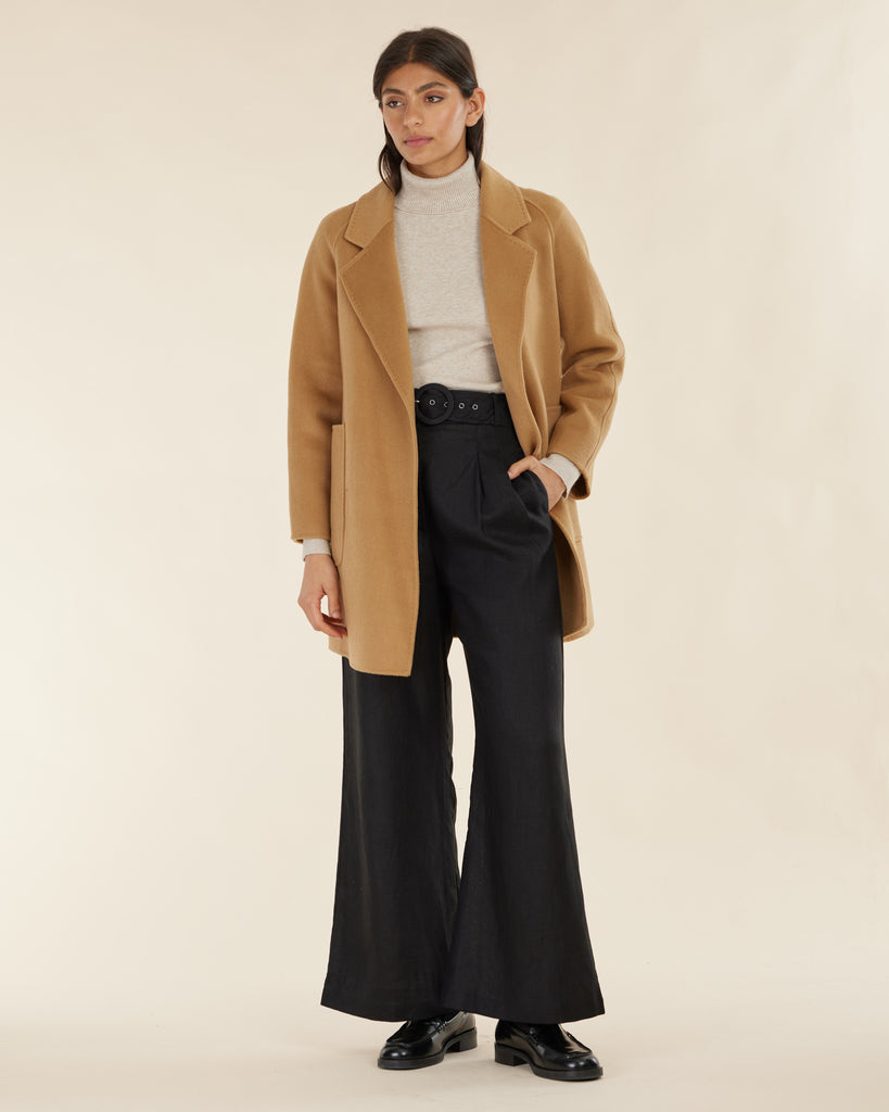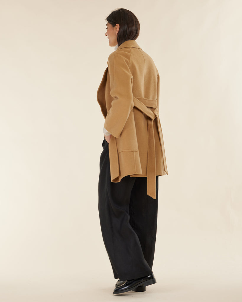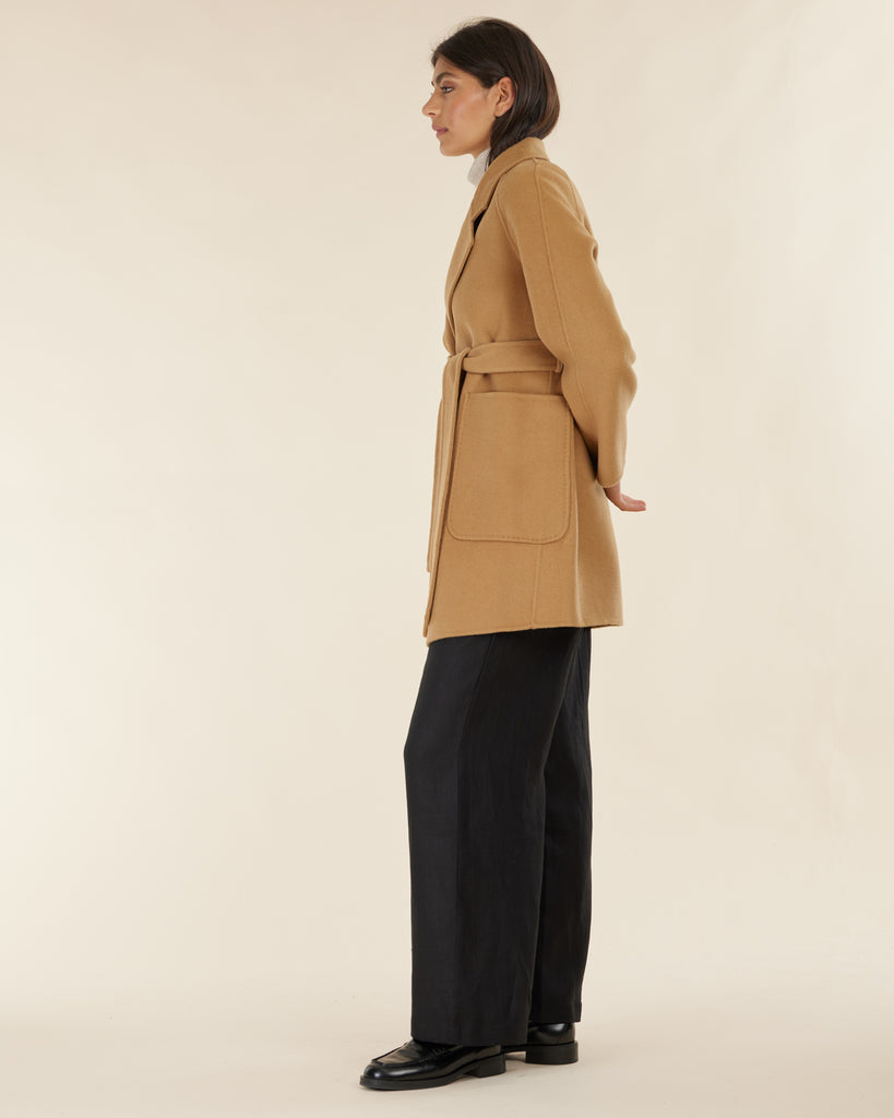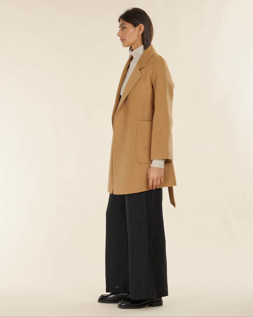 The Fontaine Single Breasted Robe Coat blends classic tailoring with soft structure. Made from 100% Australian wool, it features a wrap-style front, oversized patch pockets, and a self-tie belt for adjustable shaping. A refined outer layer designed to bring comfort and polish to cool-weather dressing.