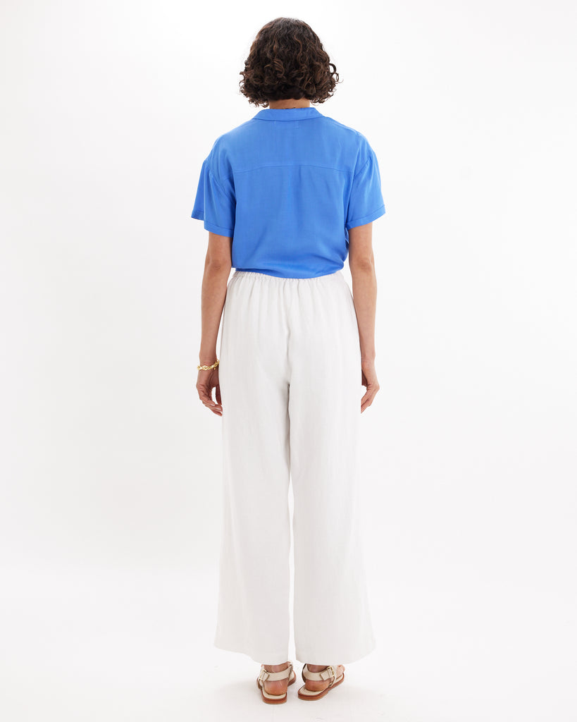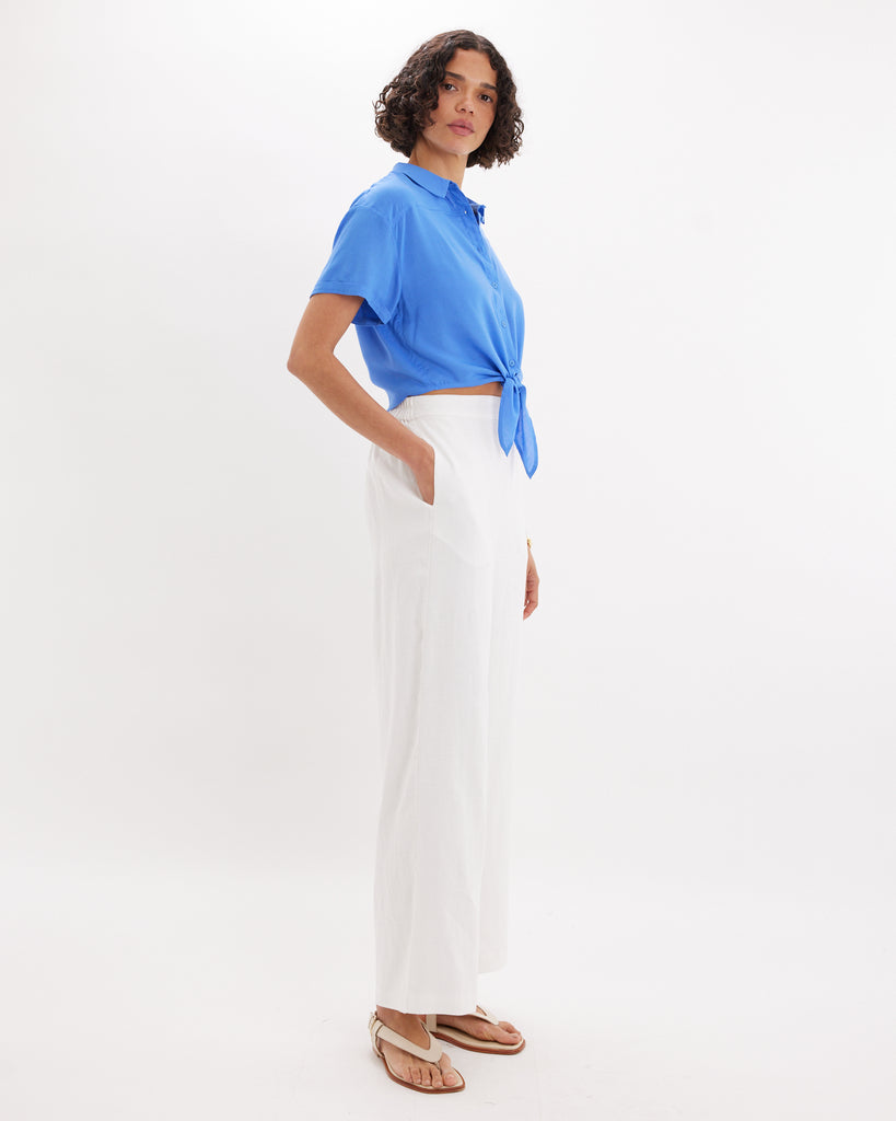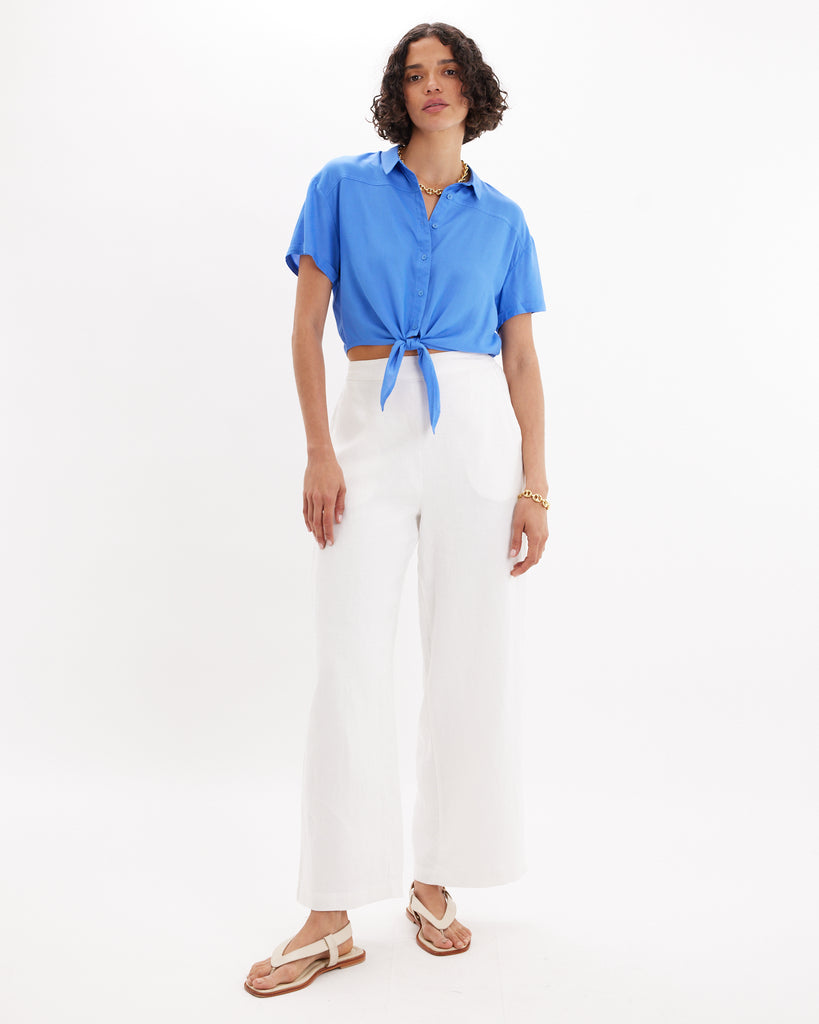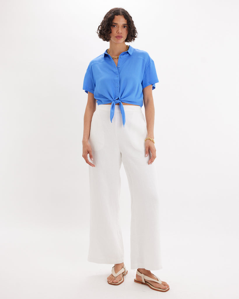 The Amabel Short Sleeve Crop Shirt is a playful warm-weather staple with a soft, fluid drape. Cut to a relaxed cropped silhouette, it features a classic shirt collar, button-through front and tie-front hem for easy styling with high-waisted skirts, shorts or denim.