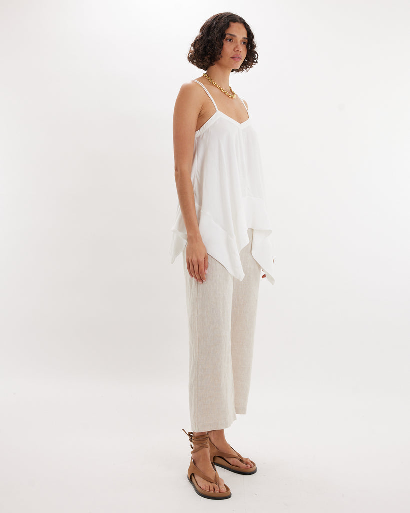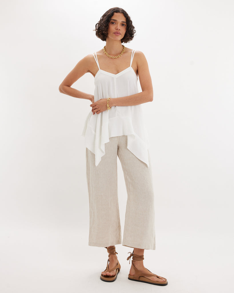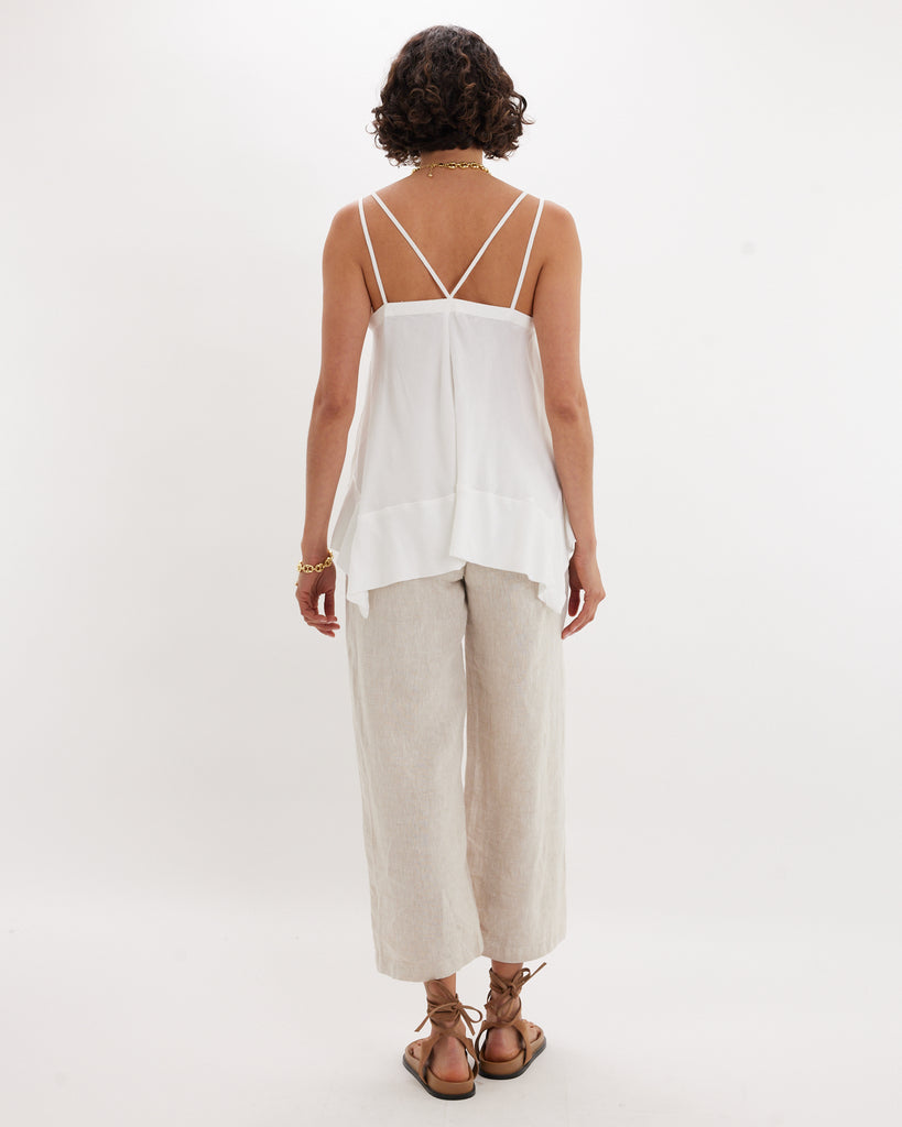 The Damiana Asymmetric Top is a lightweight, feminine essential designed for effortless warm-weather dressing. With its soft drape and fluid handkerchief hem, this style offers a relaxed silhouette elevated by delicate double straps and a gentle V-neckline. Pair it with linen or denim for an easy yet refined look.