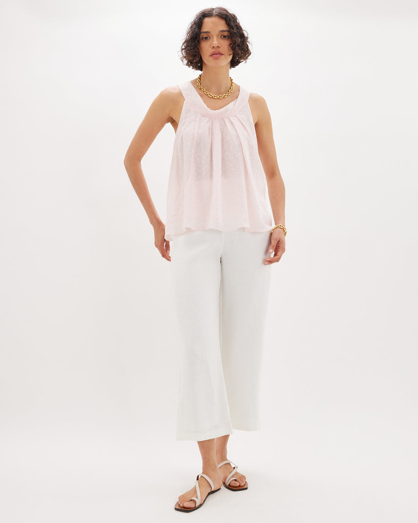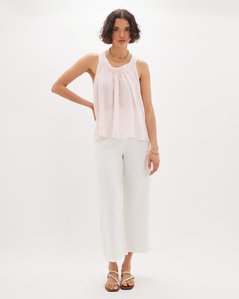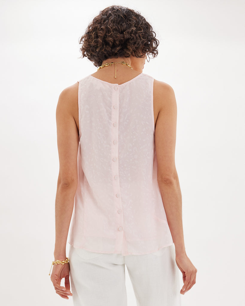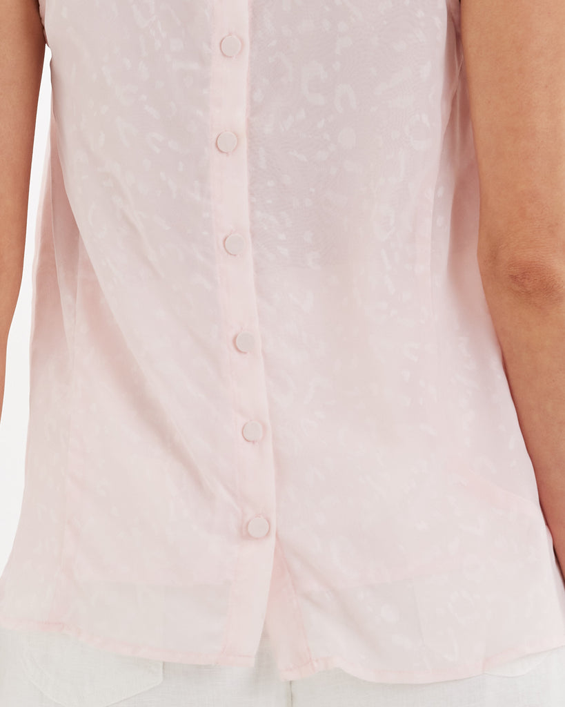 The Leandra Sleeveless Top is a lightweight, feminine piece featuring soft pleats and a subtle leopard jacquard. Designed with a round neckline and button-back closure, it offers an airy silhouette ideal for relaxed dressing.