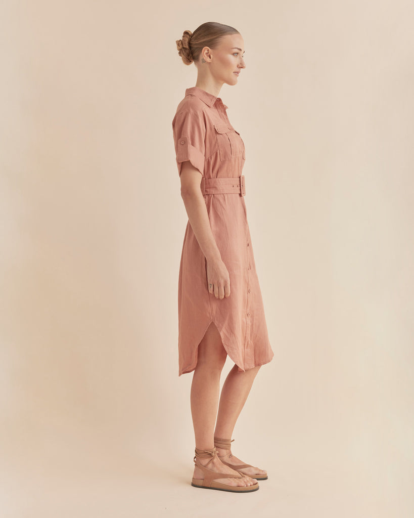 The Provence Linen Shirt Dress is the perfect day-to-night look. Crafted from 100% linen fabrication, this breathable midi silhouette features a self-covered belt, rolled sleeves, buttoned front, breast, and side pockets. The ultimate linen dress made ready-to-wear.