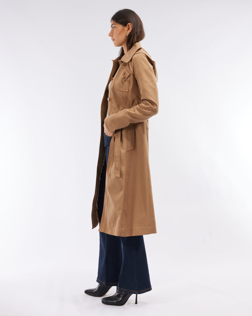 The Tori Hooded Trench Coat redefines outerwear with its tailored silhouette and utilitarian finish. Designed with a flattering cinched waist, contrast stitching and storm flap detailing, it features a removable hood for added versatility. A modern trench that merges function with form, designed to layer seamlessly from work to weekend.