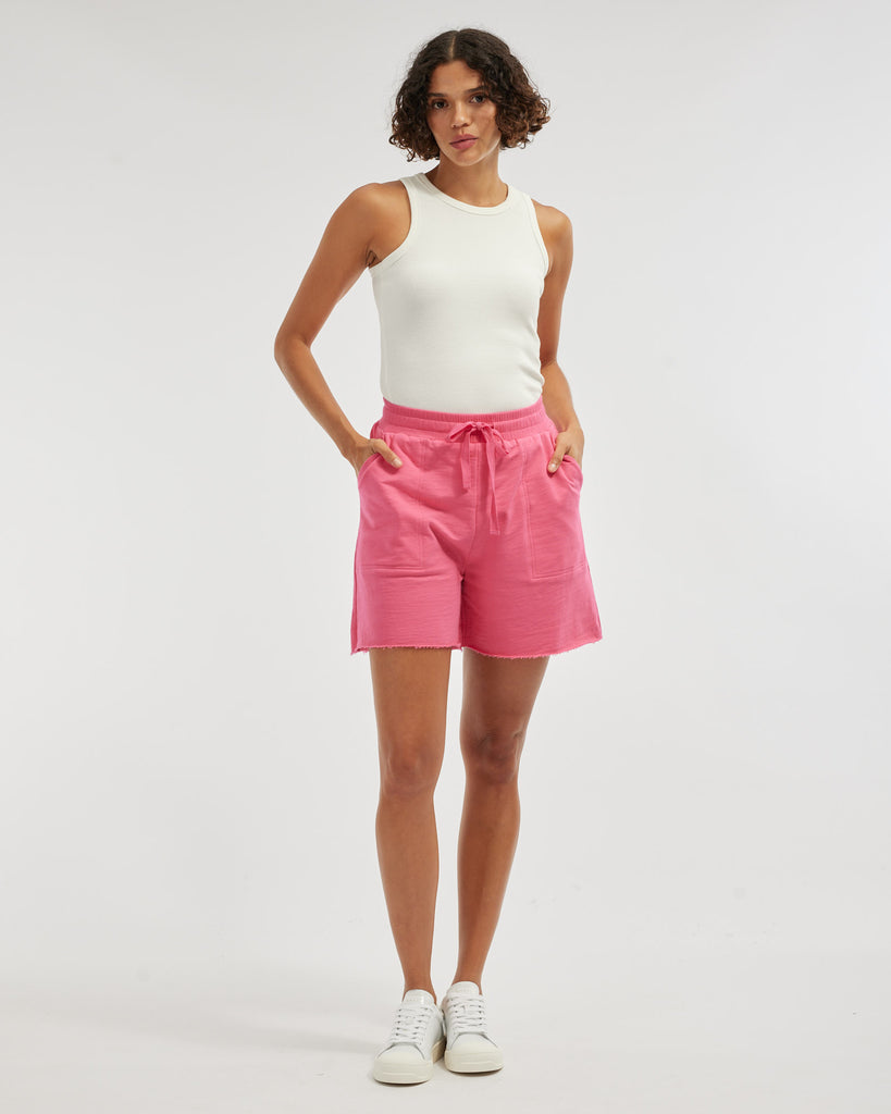 The Kendall Raw Hem Short is crafted from soft cotton for all-day comfort. A relaxed fit with raw-edge detailing and a flattering high waist creates a casual yet polished look. Perfect for lounging or casual outings.