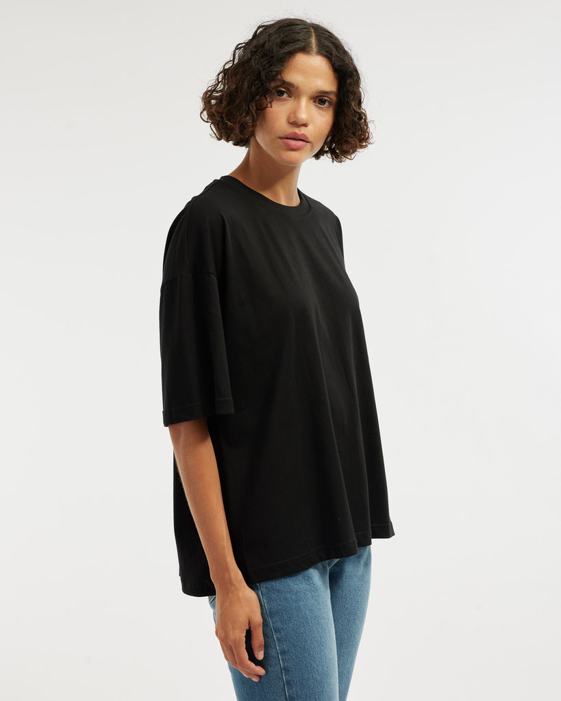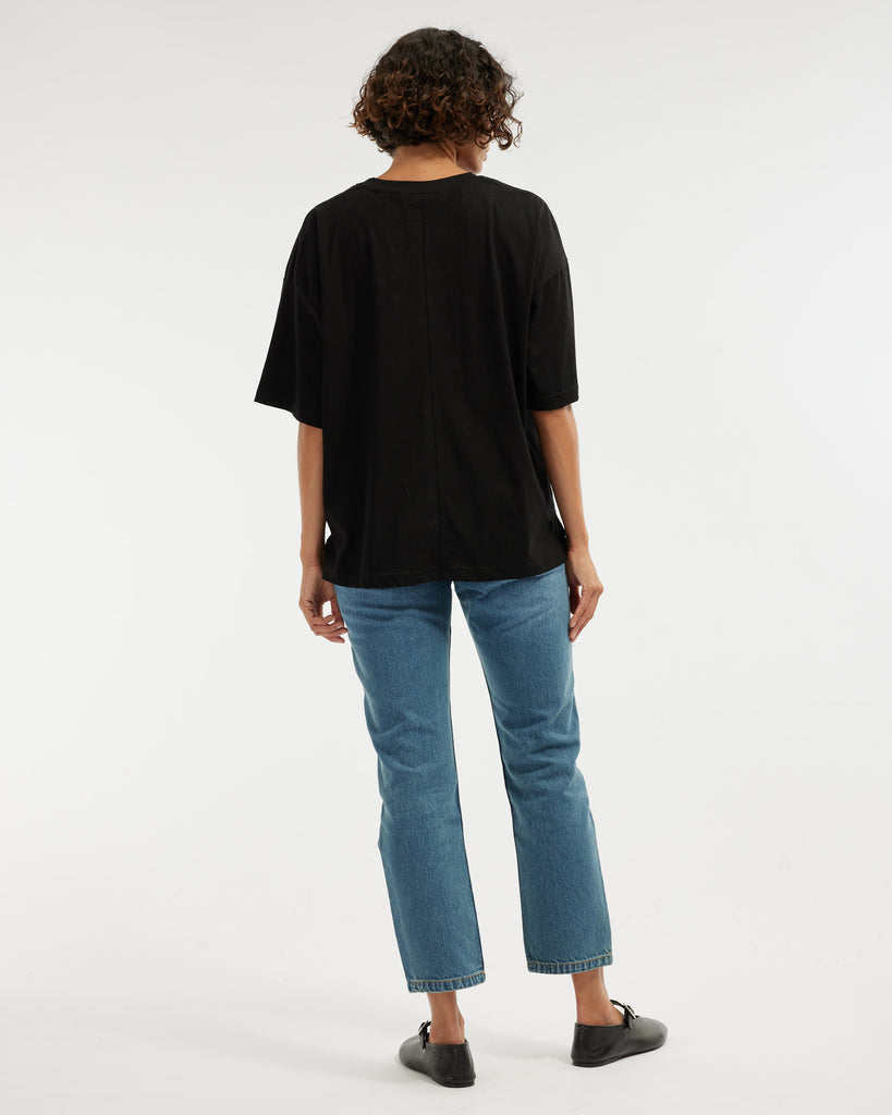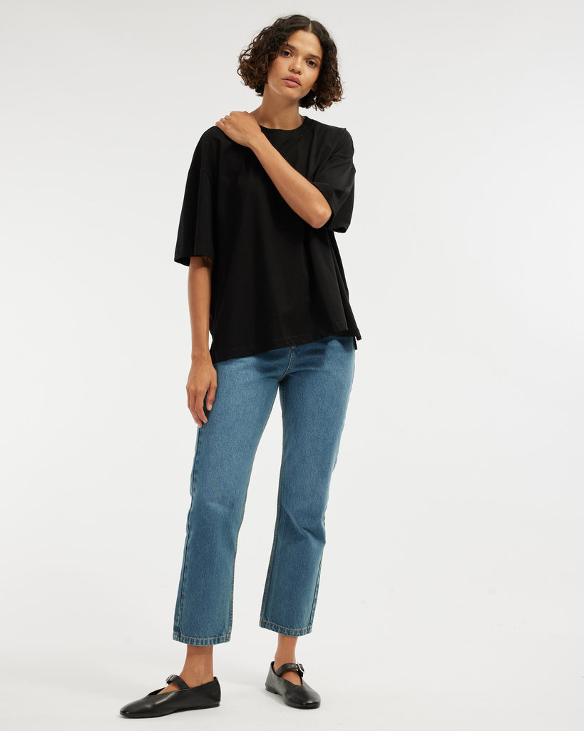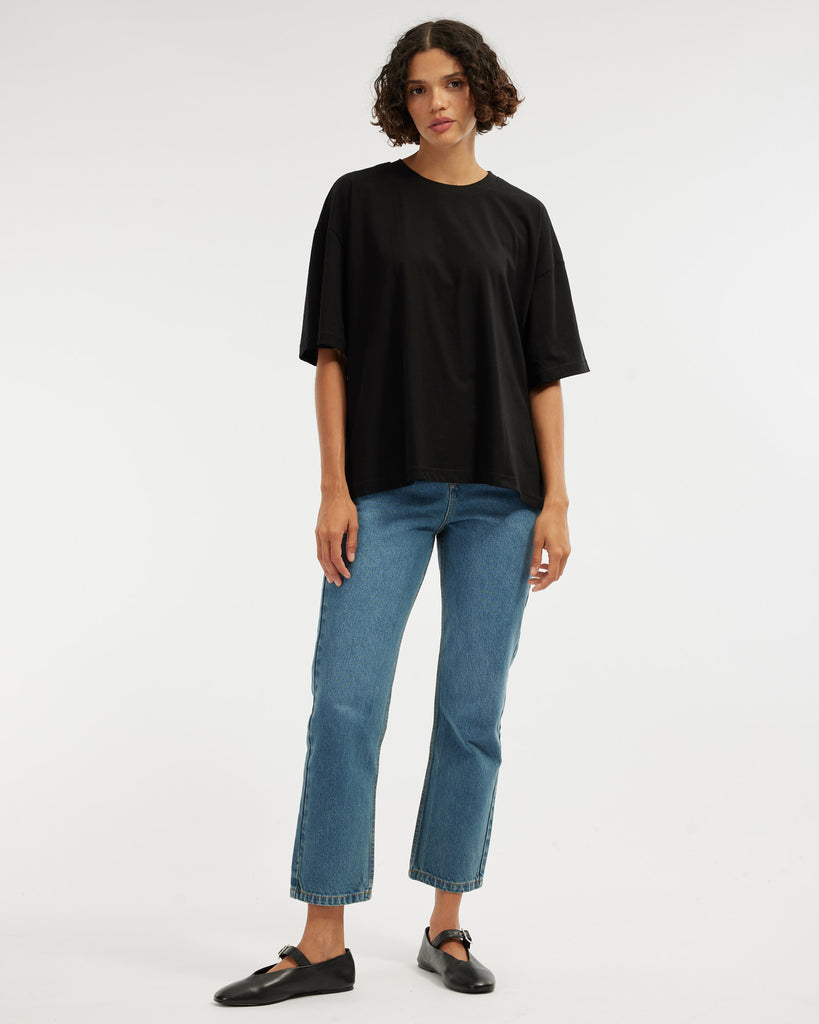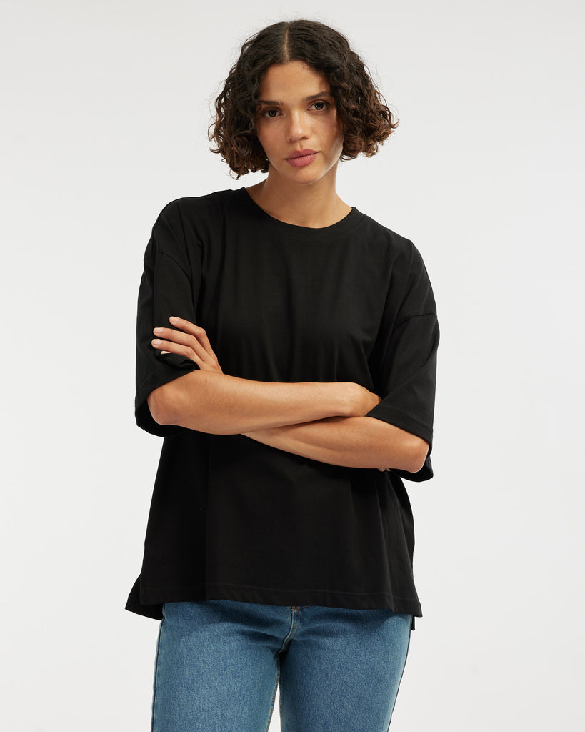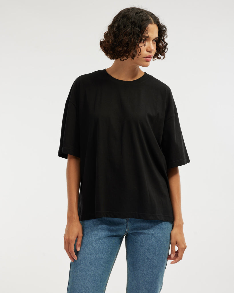 The Leah Boyfriend Tee delivers a relaxed, oversized fit with a softly draped silhouette. Crafted from breathable cotton, it features a wide crew neckline, dropped shoulders, and a straight hem for a laid-back appeal.