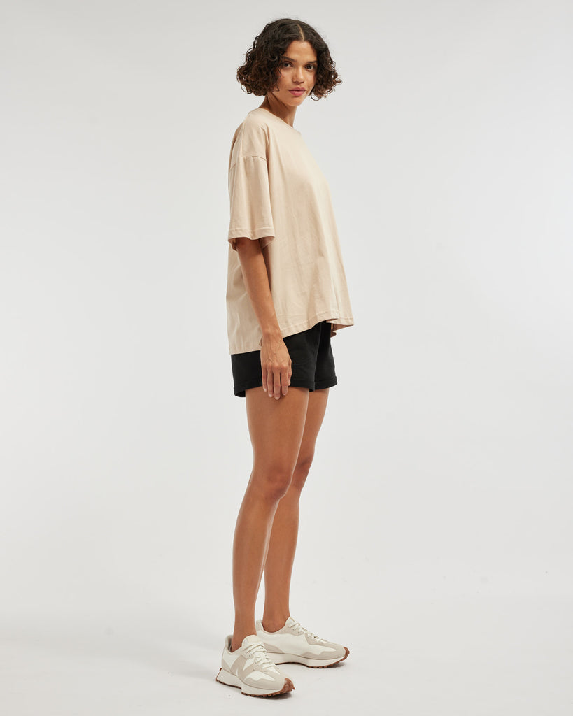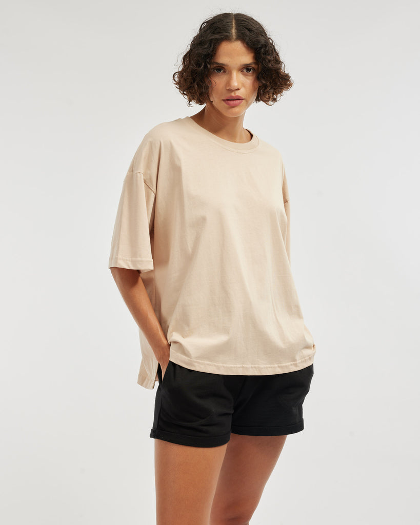 The Leah Boyfriend Tee delivers a relaxed, oversized fit with a softly draped silhouette. Crafted from breathable cotton, it features a wide crew neckline, dropped shoulders, and a straight hem for a laid-back appeal.
