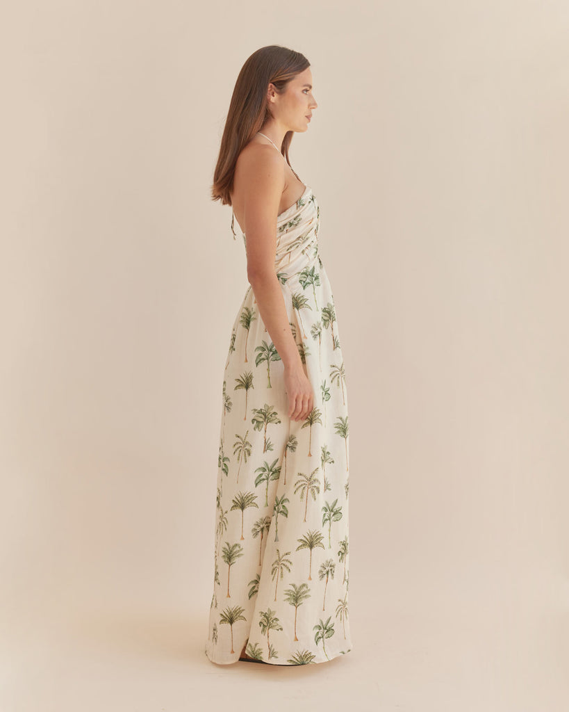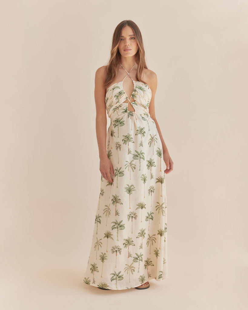 The Palma Halterneck Dress offers a refined yet effortless silhouette, featuring a lush tropical print. Its halterneck design elegantly frames the neckline, while cutout details provide a flattering, feminine touch. Perfect for relaxed daytime outings or casual evening affairs.