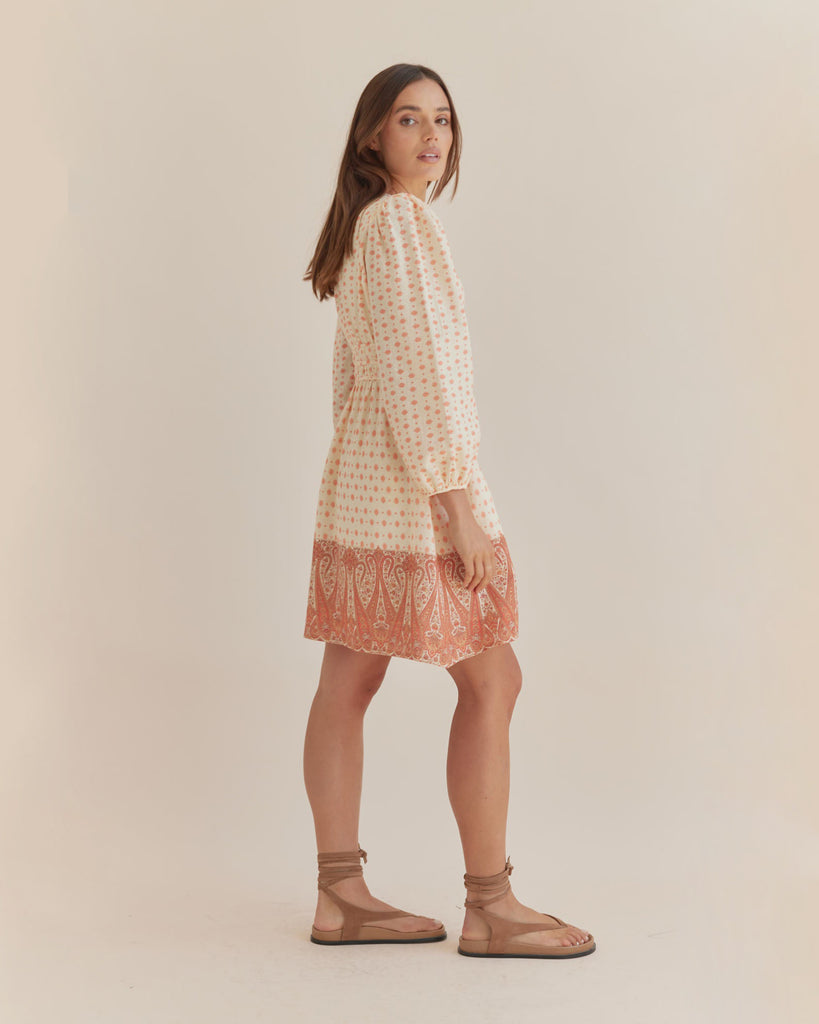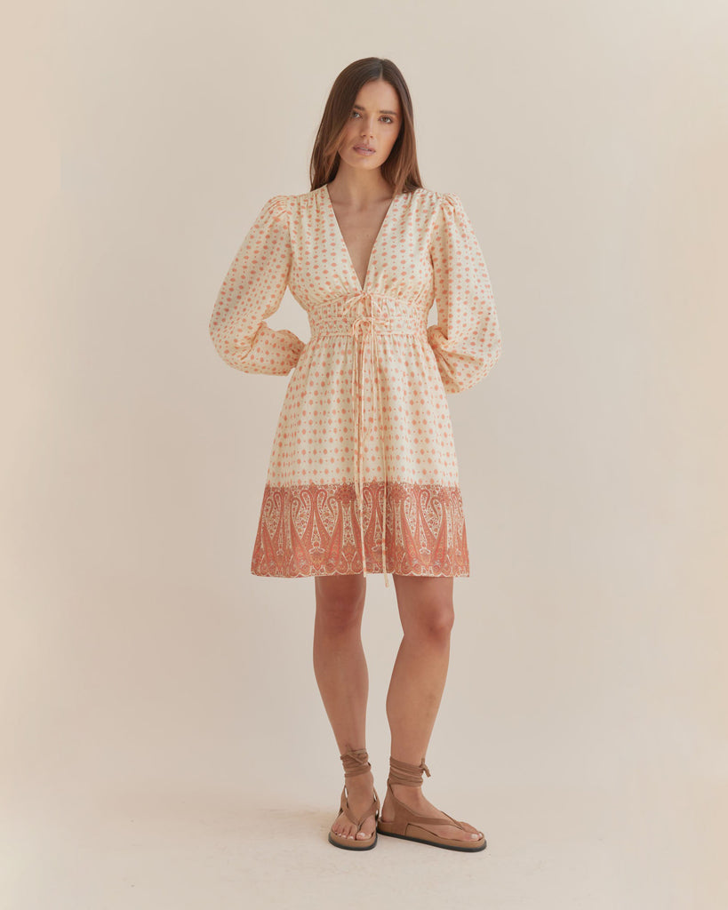 This enchanting Peach Paisley Mini Dress brings effortless femininity to your wardrobe. Featuring a V-neckline, a soft gathered waist with ties, and long voluminous sleeves, this dress is both comfortable and chic. The playful paisley pattern complements the flattering silhouette, making it a versatile piece for various occasions.