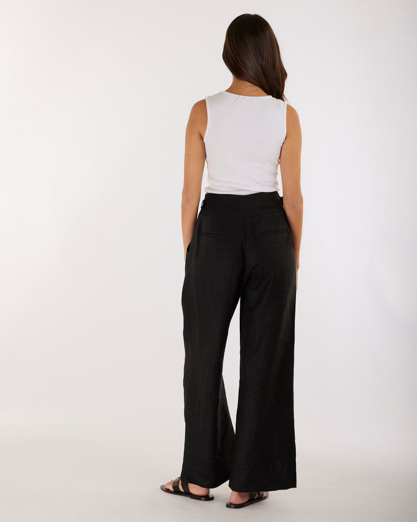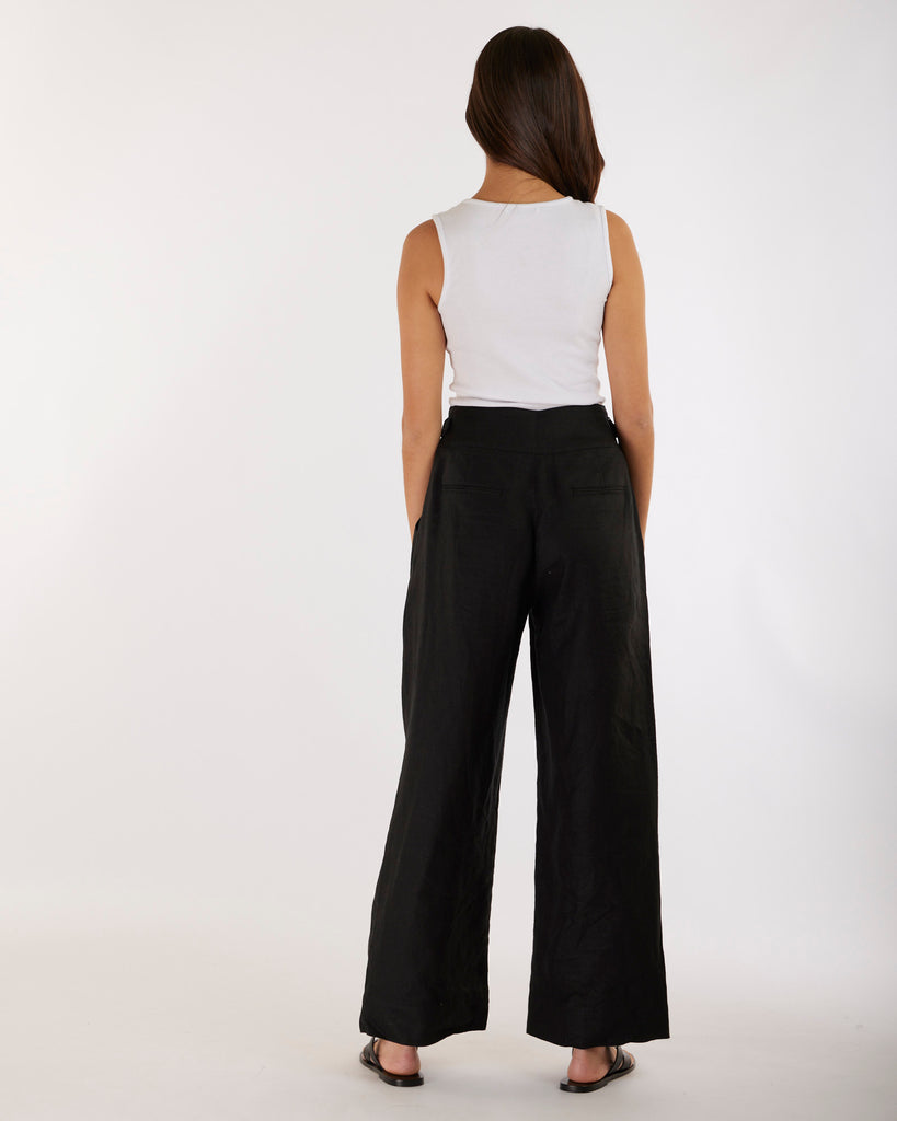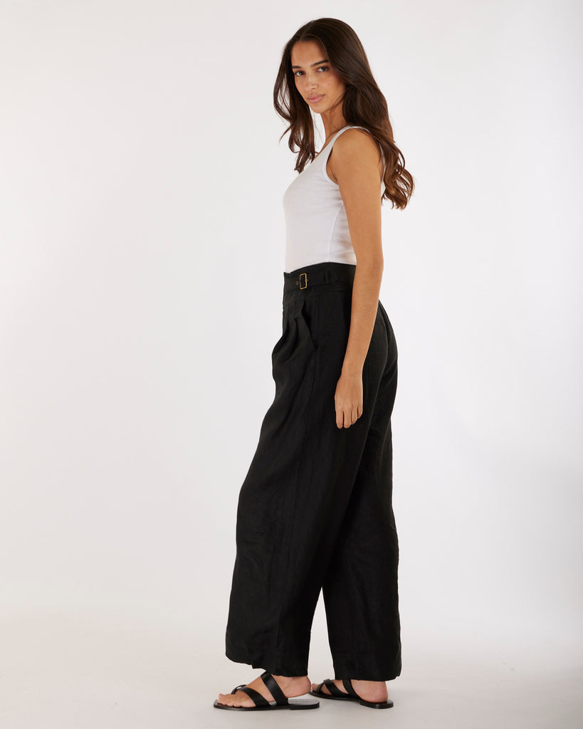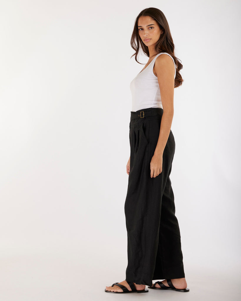 Destined to be your next forever linen pants, the Eugene Linen Pants features a naval gurkha buckled waistband, fully adjustable for a high or mid-waisted fit, dual side pockets and neat pleating for both a tailored and clasically sophisticated look.
