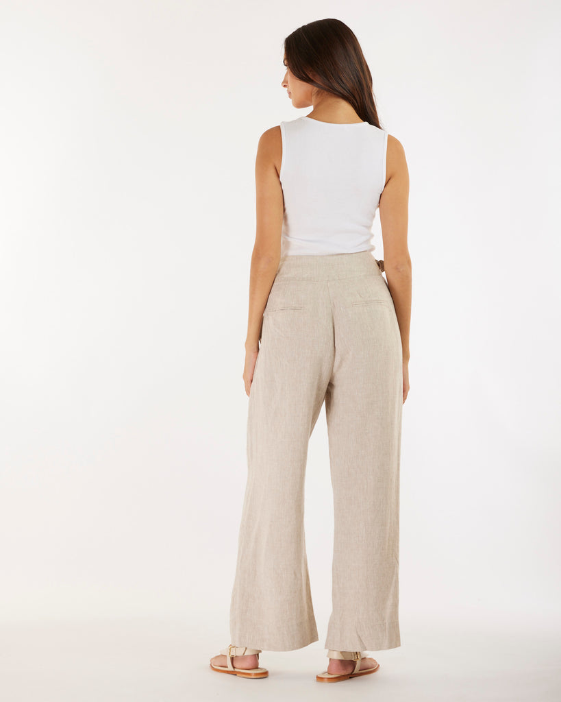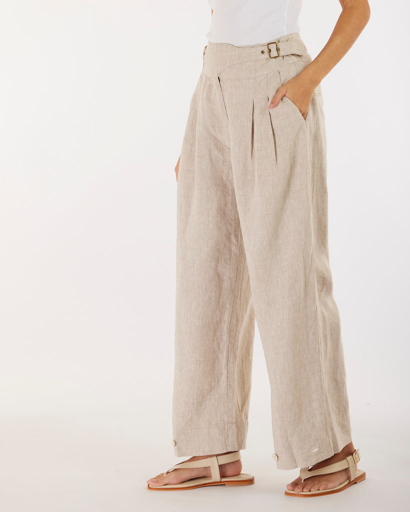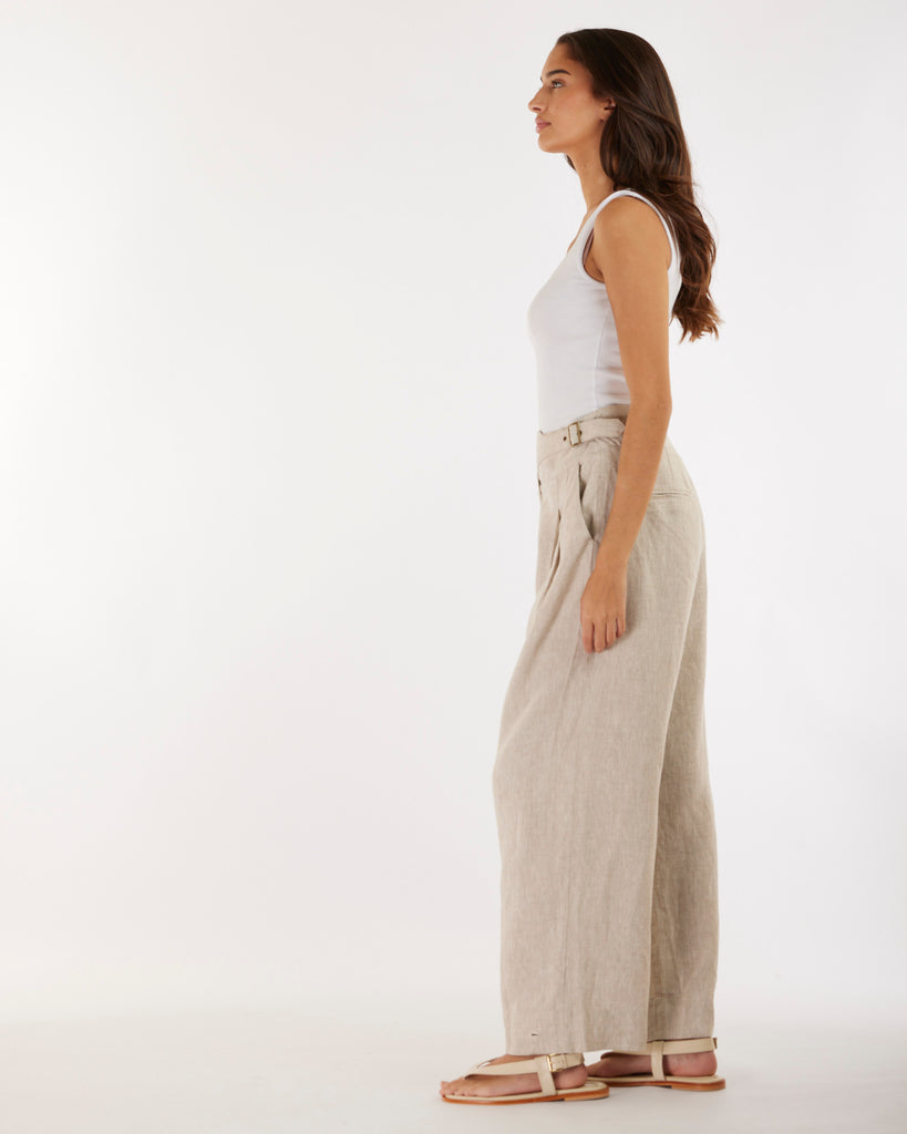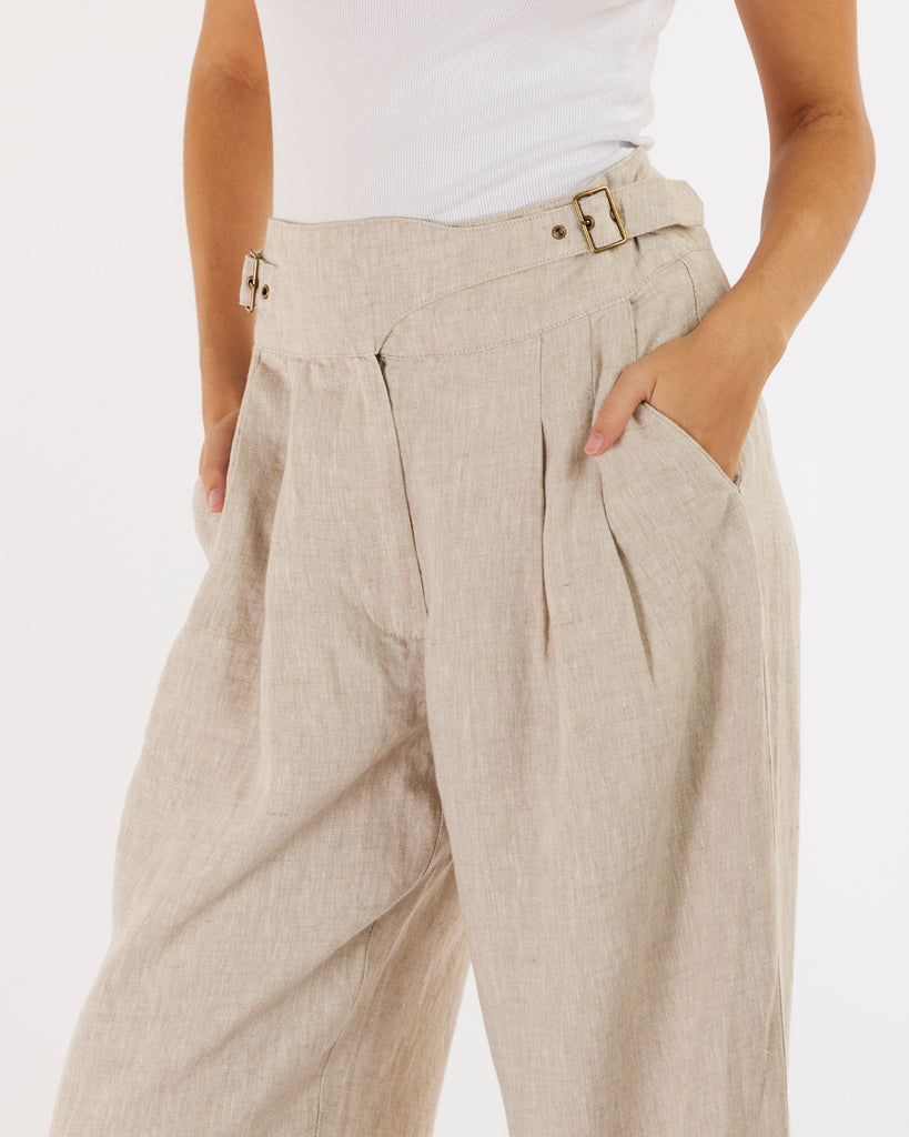 Destined to be your next forever linen pants, the Eugene Linen Pants features a naval gurkha buckled waistband, fully adjustable for a high or mid-waisted fit, dual side pockets and neat pleating for both a tailored and clasically sophisticated look.