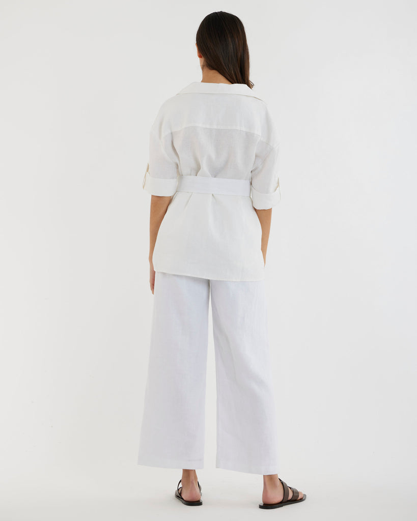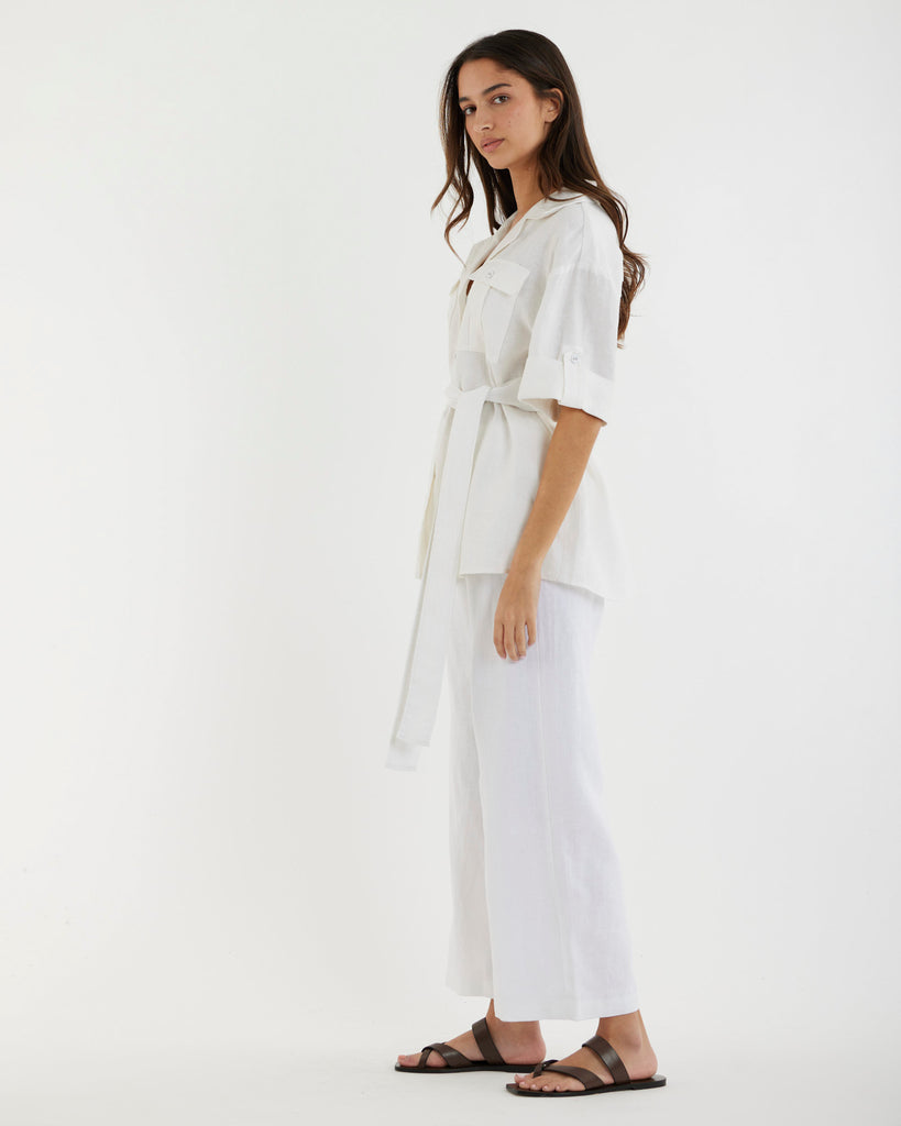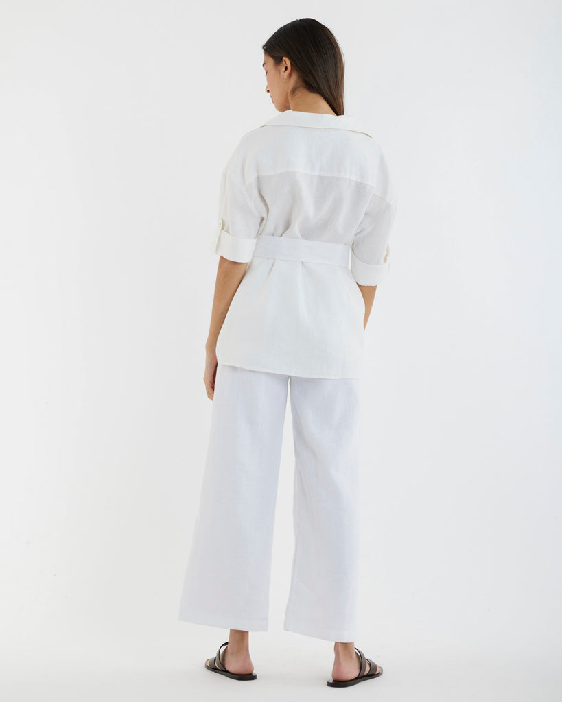 Behold the sophistication of the Jade Oversized Linen Shirt, a laid-back luxury crafted from 100% linen. This shirt combines a relaxed fit with comfort and style, featuring a collared neckline, double breast pocket, and a modern touch with tab and button detail at rolled sleeve cuffs. Adorned with self-covered buttons and a button-up closure, the shirt offers versatility with a removable waist tie, creating the perfect blend of ease and elegance for your casual wardrobe.