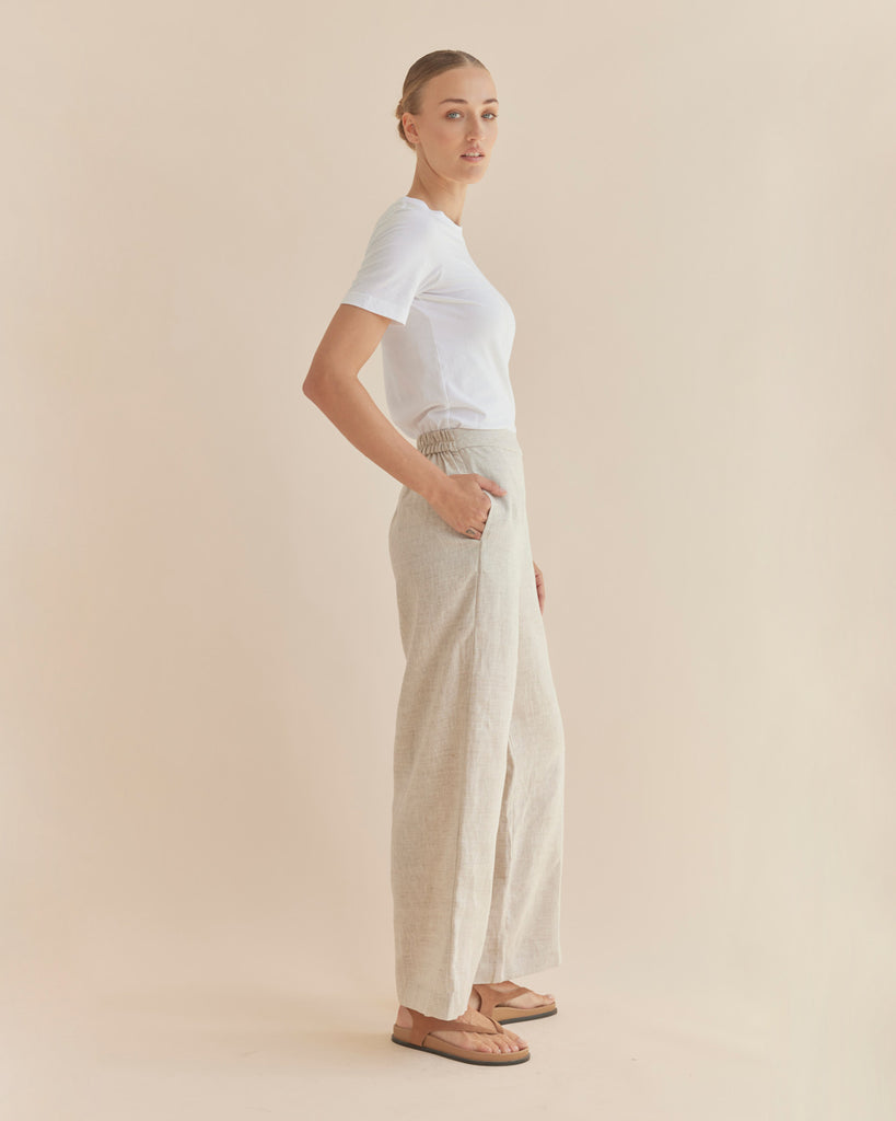 The Mabel Linen Pant reinvents the classic linen pant with its contemporary and simplistic approach. Spun from 100% linen, these pants sit high on the waist to flatter all body types, includes dual side pockets for practicality, an elasticated waist band for comfort and stretch and finishes off with a wide leg silhouette. Relaxed and effortless, they make for the ultimate wardrobe essential.