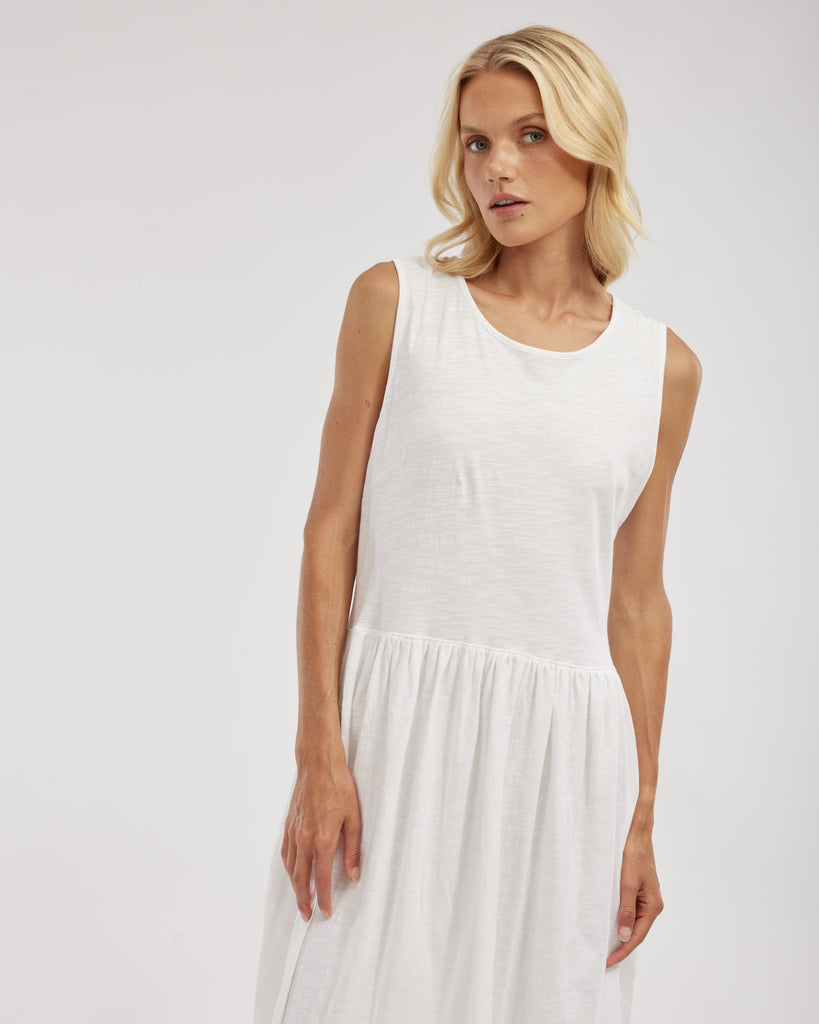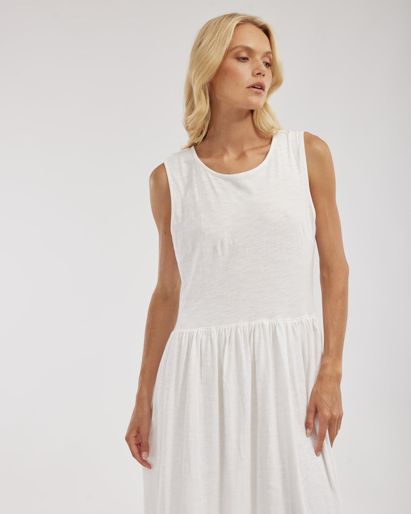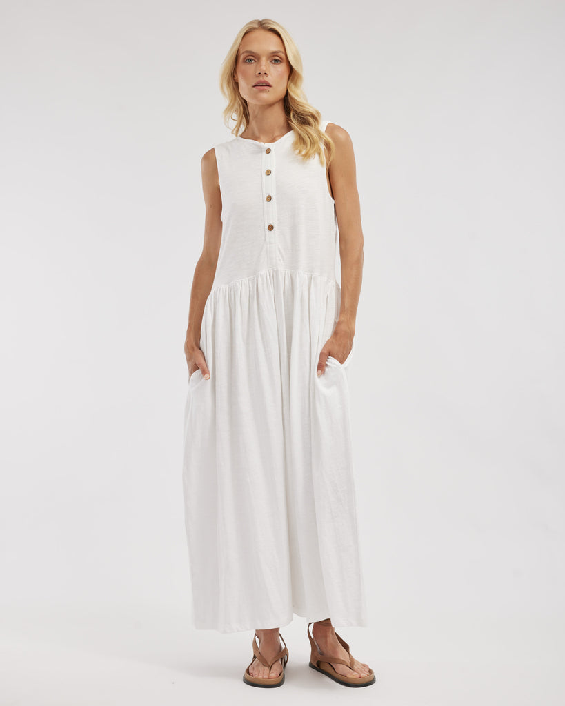 The Jacki Reversible Maxi Dress by Amelius offers two looks in one with its versatile design. Crafted from soft 100% organic cotton, it features a sleeveless silhouette, gathered waist, and a button-down or scoop-neck option. A flowing maxi length adds elegance to this everyday staple.