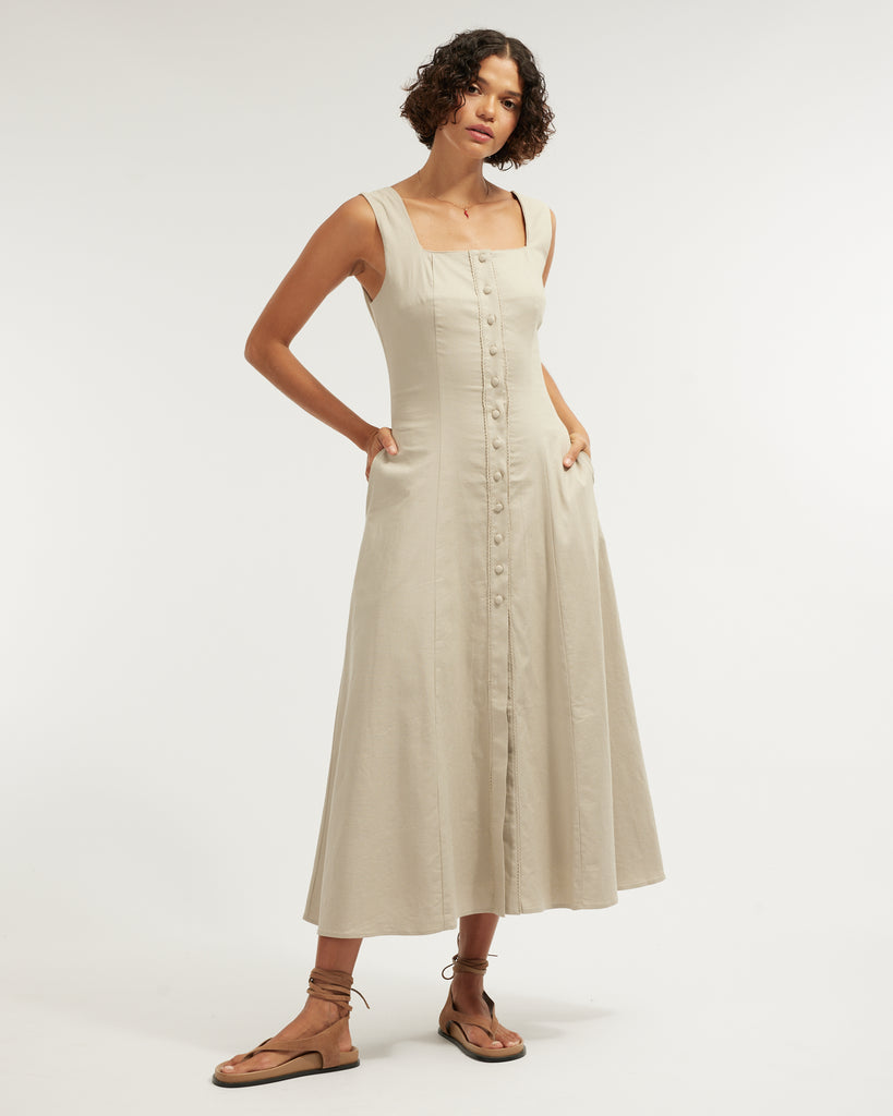 Introducing our Lucie Buttoned Midi Dress – an enchanting piece crafted from a stretch linen viscose blend that moves beautifully with you. This feminine design features a flattering fit and flare silhouette enhanced by an a-line skirt. Delicate cotton lace trim adds romantic detail, while the thoughtful construction ensures a bra-friendly fit. The stretch fabric blend offers comfort and ease throughout the day.